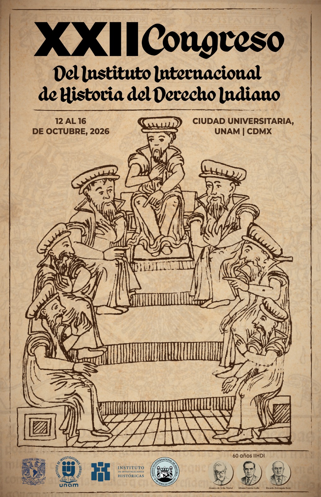El Instituto Internacional de Historia del Derecho Indiano, a través del Instituto de Investigaciones Jurídicas y el Instituto de Investigaciones Históricas de la Universidad Nacional Autónoma de México, presenta el XXII Congreso del Instituto Internacional de Historia del Derecho Indiano, a celebrarse del 12 al 16 de octubre de 2026 en la Ciudad de México.